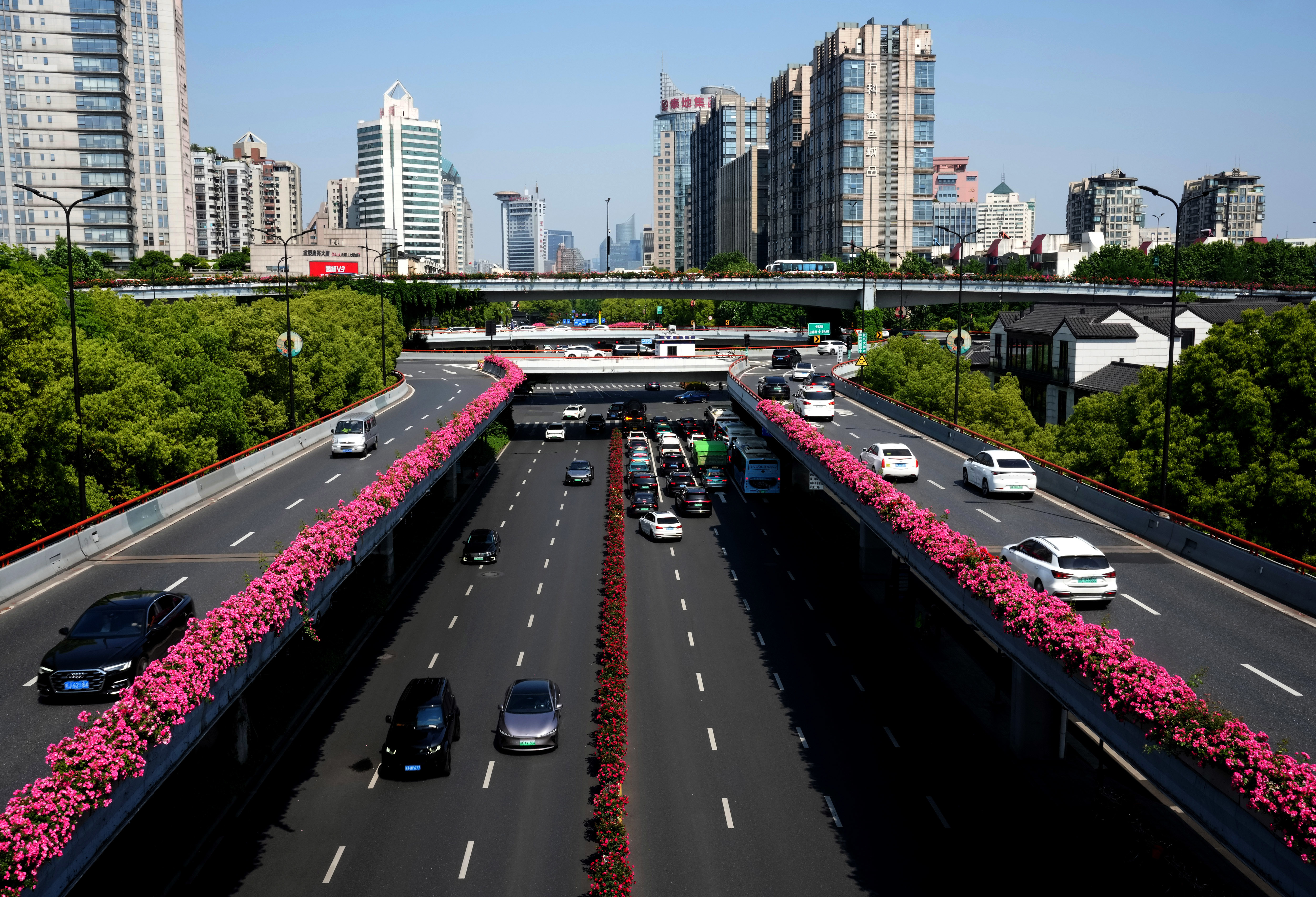 近日,杭州高架道路两侧种植的月季花盛放,呈现“空中花廊”景观。