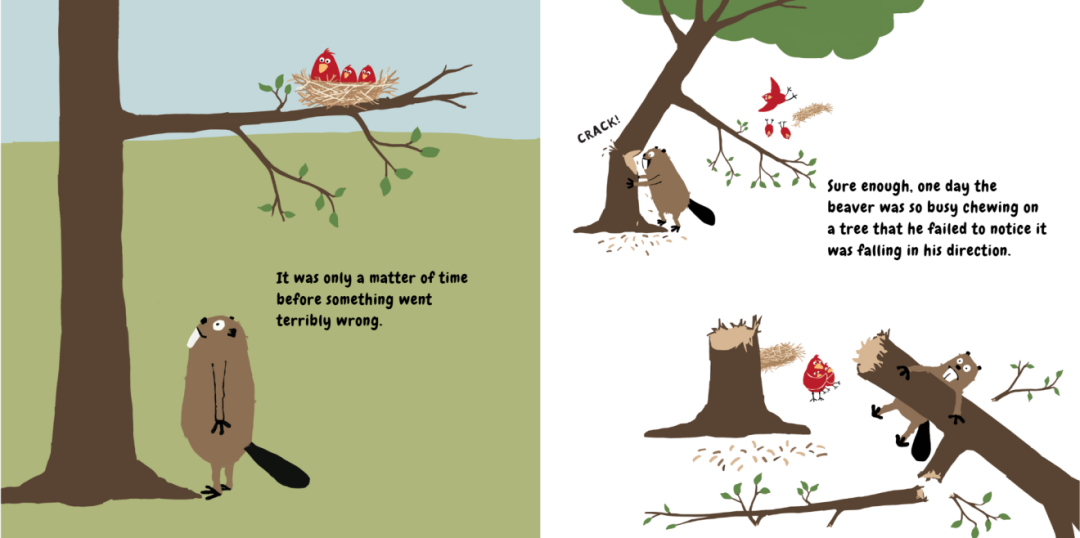 果不其然,有一天,海狸忙着啃树,完全没有注意到——那棵树正朝着他的方向倒下来。