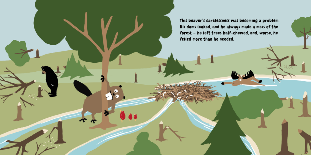 他筑的水坝漏水,还把森林弄得一团糟——树被啃得只剩一半,更糟的是,他砍倒的树远远超过了真正需要的数量。