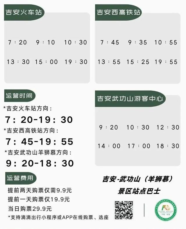 我在文旅吉安公众号扒了一张吉安⇄武功山的直通车时间表,大家可以参考,车程大约2小时,建议搭乘最早的一班车。