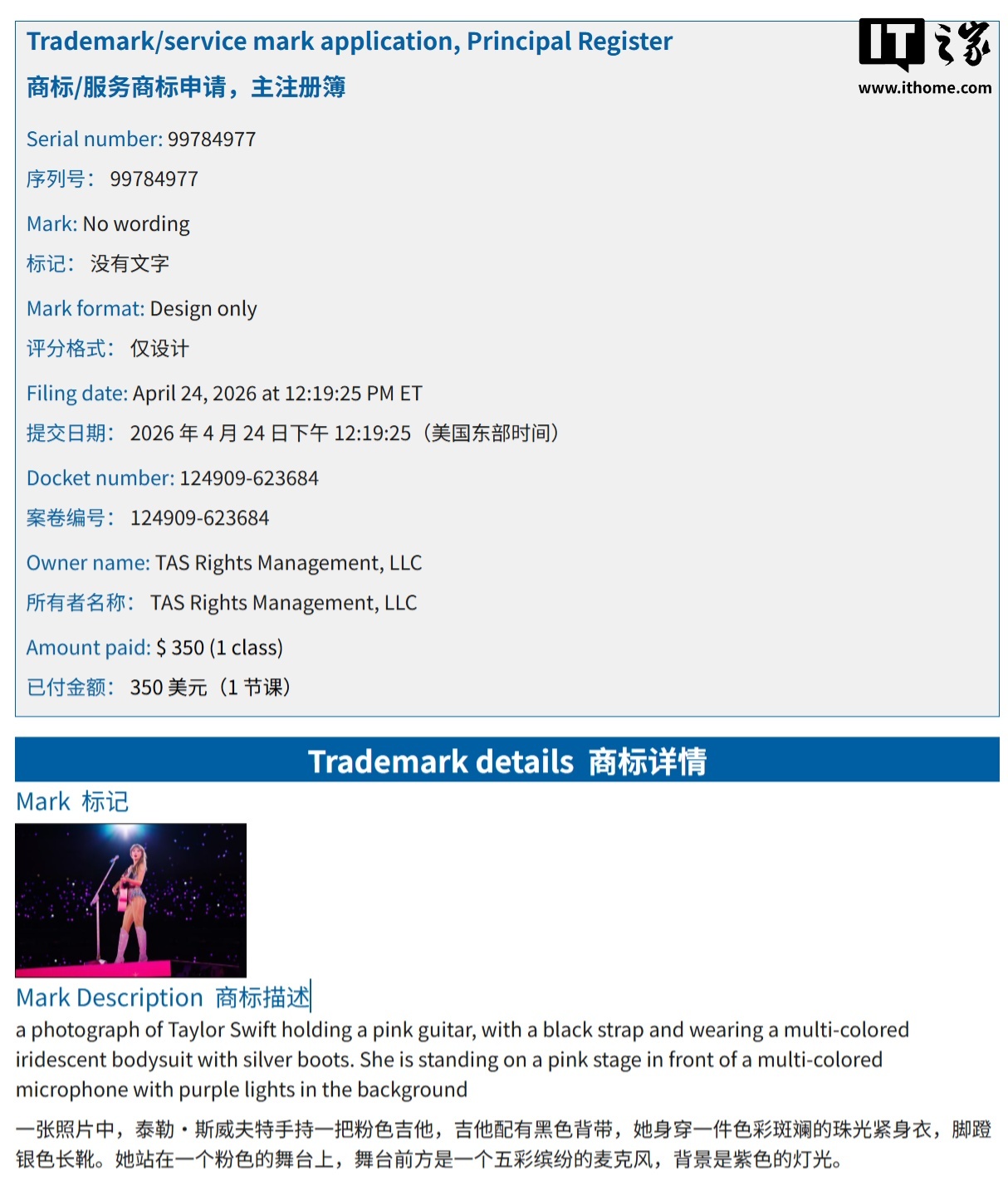 第 3 项申请为视觉商标,针对其“时代”巡回演唱会中的经典舞台形象,描述包括粉色吉他、珠光紧身衣及紫色灯光背景等具体视觉特征。IT之家附上相关截图如下: